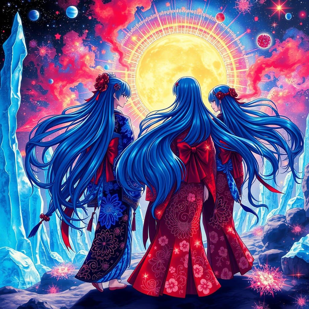 This vibrant, otherworldly scene features anime-style women with long hair, dressed in glowing kimonos, amidst a breathtaking galaxy backdrop with crystalline structures and blazing stars.