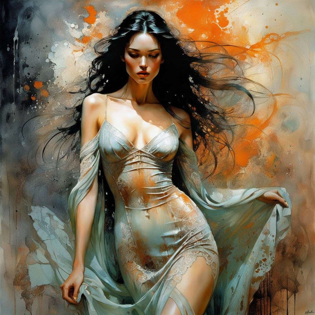 This image features a glamorous woman with wet hair and skin, wearing a lace dress. It is rendered as a vibrant oil painting with soft focus and luminous depth in jade and orange tones.