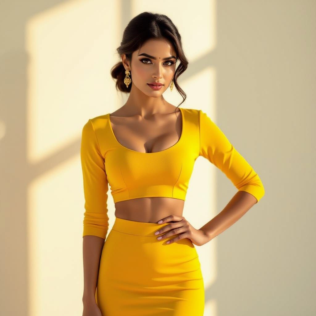 A photorealistic portrait of a beautiful Indian woman in a striking yellow outfit, captured in soft golden hour light. Her elegant pose and serious expression convey poise and sophistication.