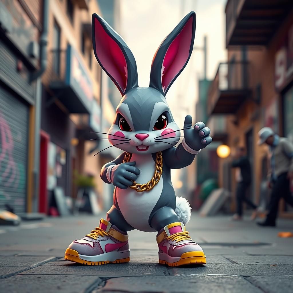 This image shows a pixel art bunny character in an urban hip-hop style. The low-poly design features bright colors, bold outlines, and dynamic lighting, reminiscent of modern 3D game art.