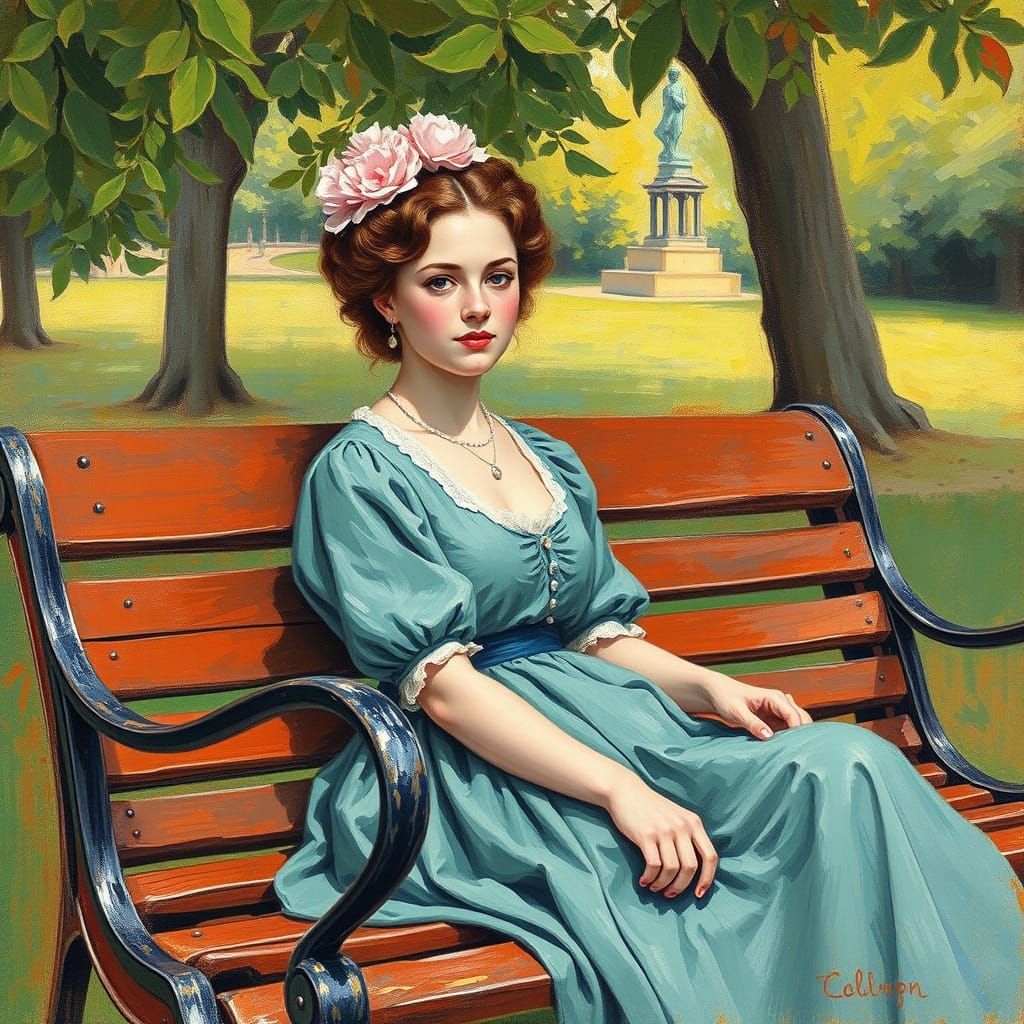 This image is a vibrant, abstract depiction of a young woman sitting on a park bench, set against a backdrop of complementary colors and fine details, reminiscent of oil pastel art from the 19th century.