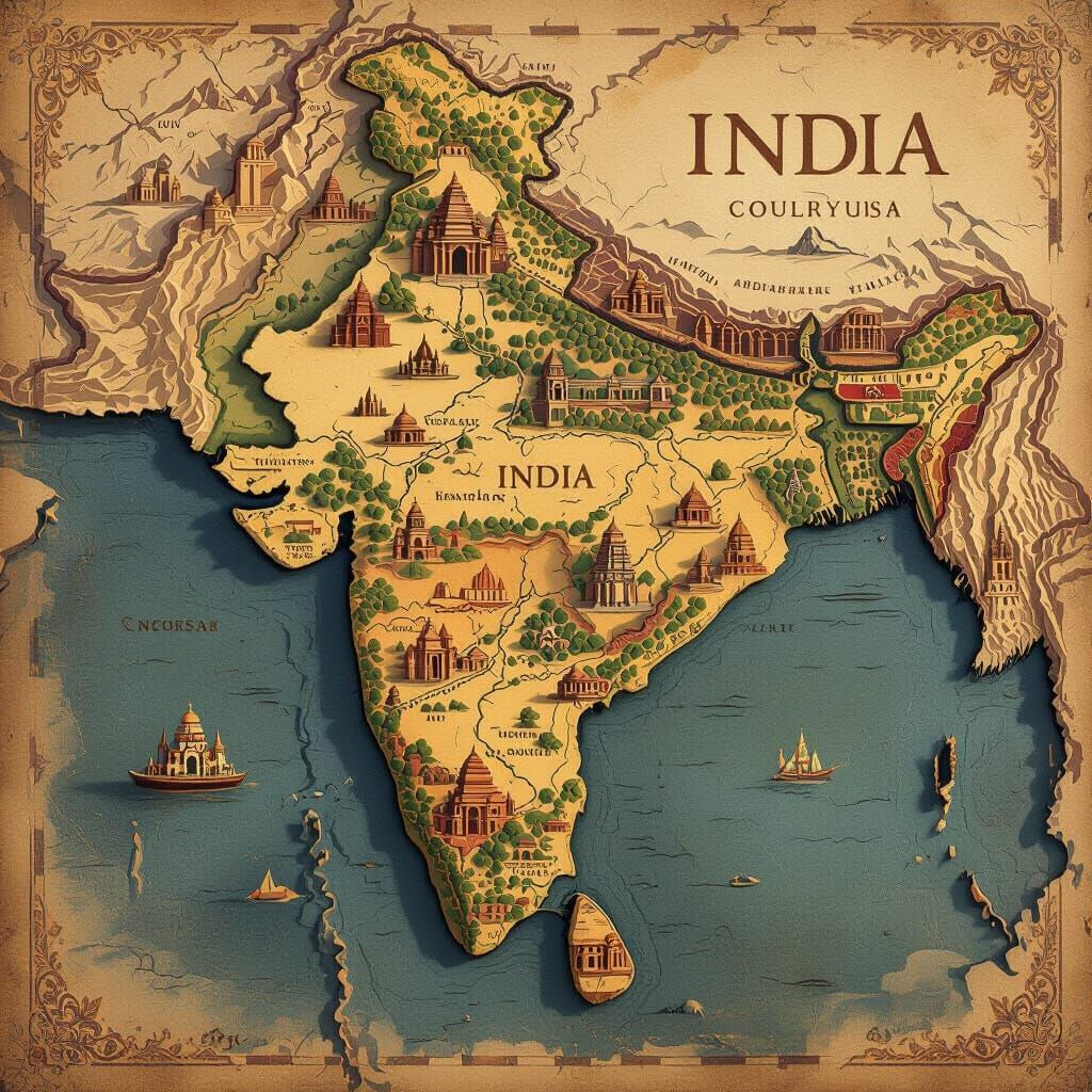 This image features a highly detailed 3D map of India with aged parchment textures and earthy tones. It is adorned with traditional motifs and landmarks, presented in a vintage style with cinematic detail.