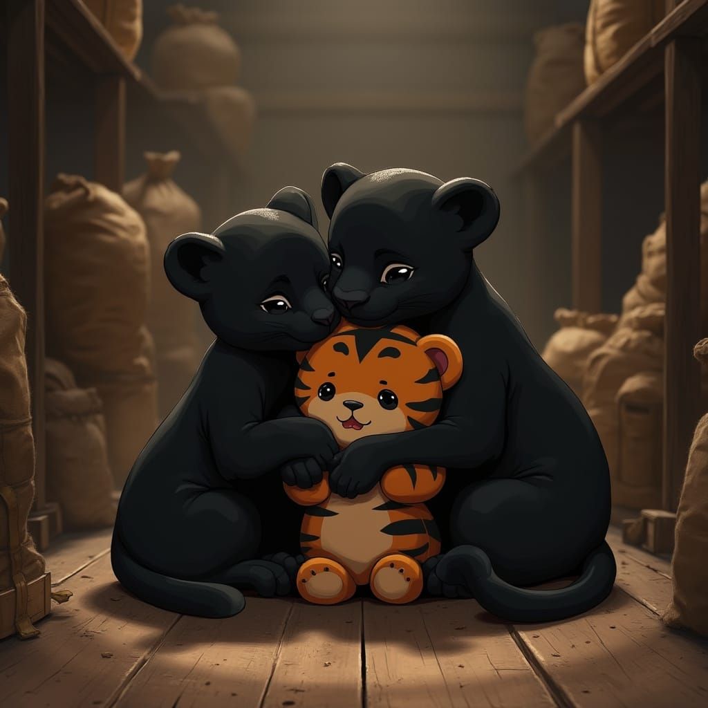 A heartwarming image of a black panther and tiger cub in a rustic shed setting. The animals hold teddy bears resembling each other, bathed in warm, soft lighting, reminiscent of anime art.