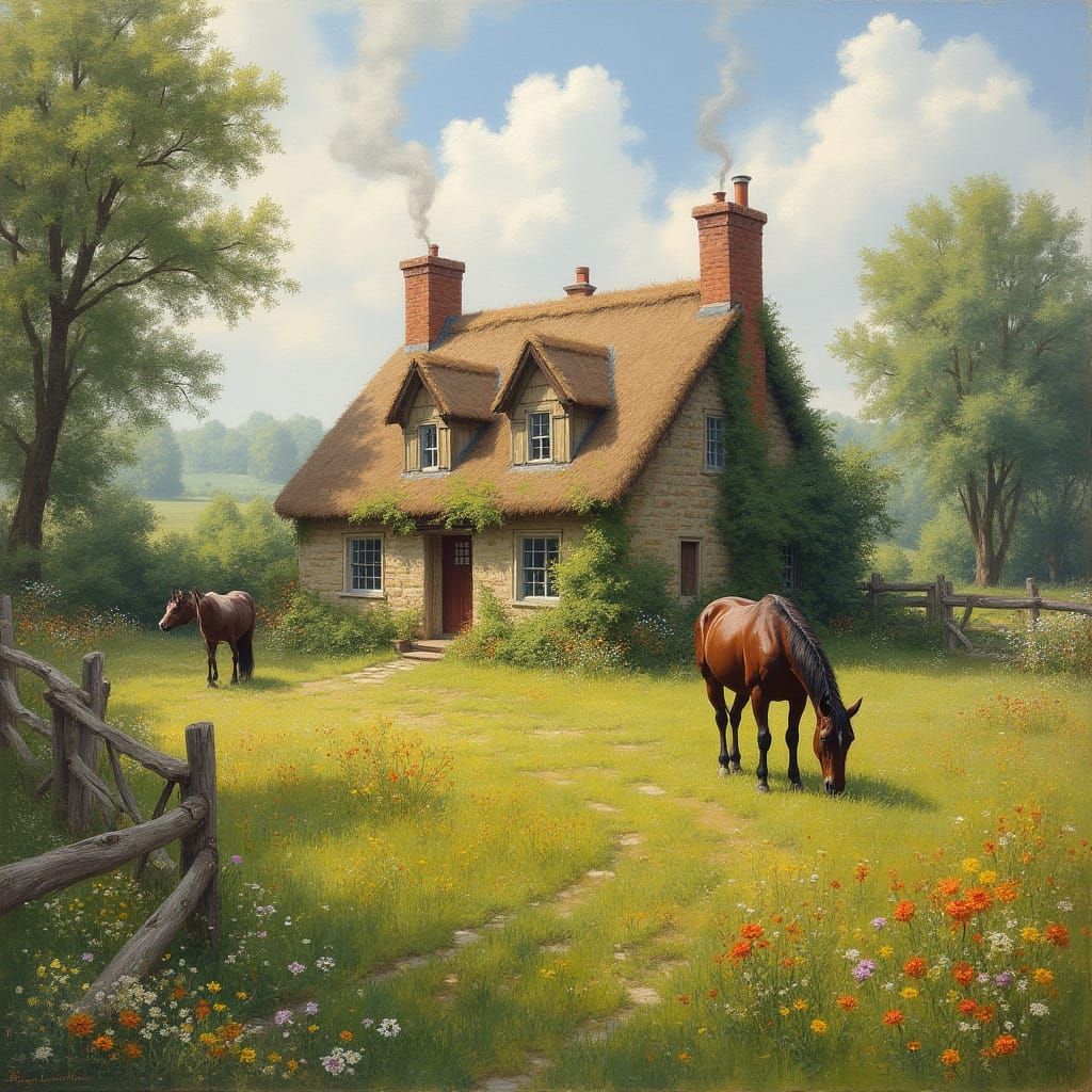 This image shows a charming cottage scene with horses grazing peacefully in a wildflower meadow. The idyllic landscape is rendered with soft brushstrokes reminiscent of impressionist paintings.