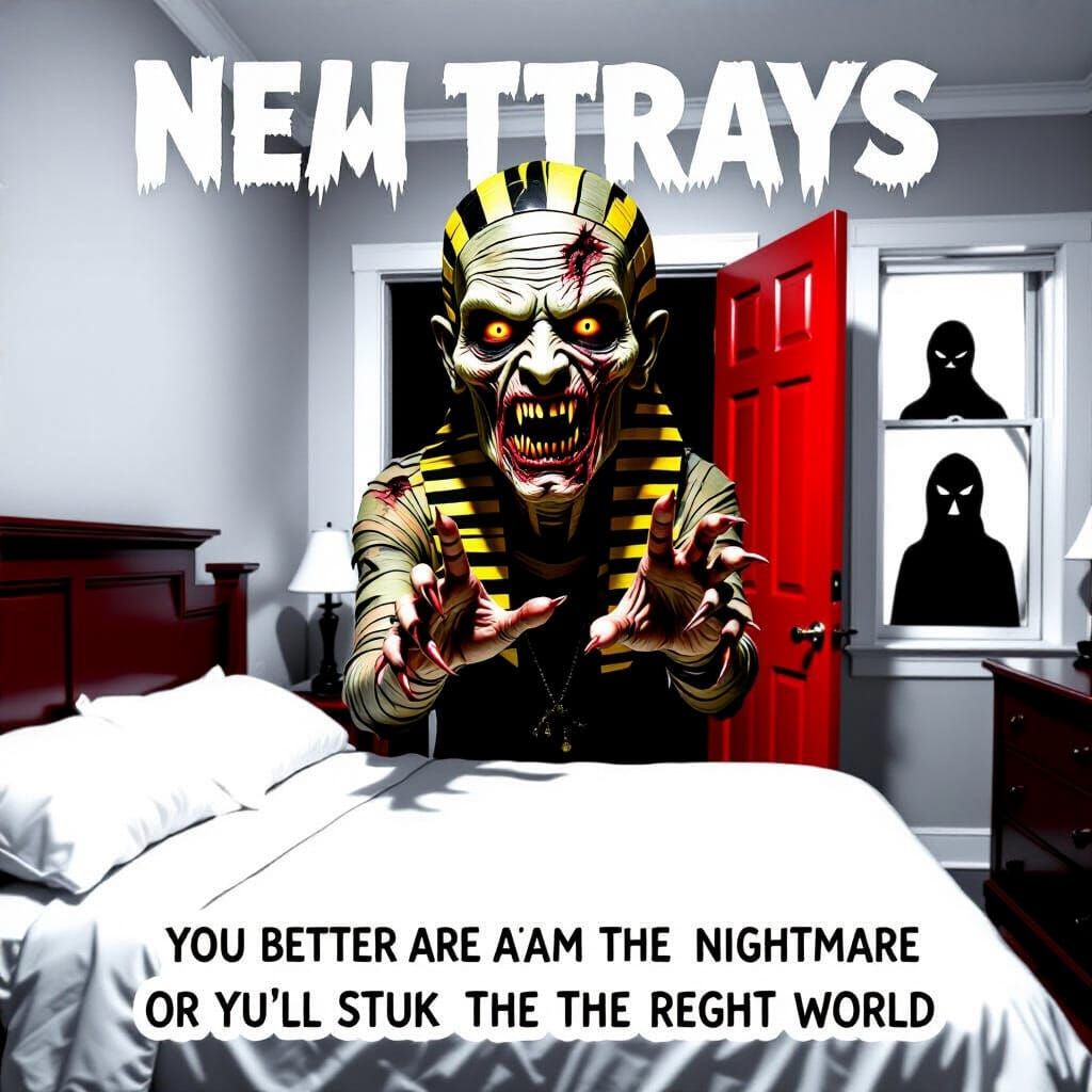 A chilling image of a six-foot mummy resembling an undead pharaoh with decayed skin, staring intensely. The scene is set in a dark bedroom with ominous shadow figures, creating a terrifying, nightmare-like atmosphere.