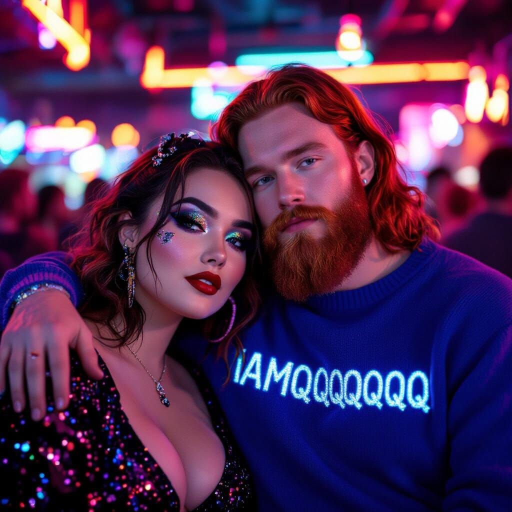 A romantic portrait of a chatty Canadian Gen-Z girl with curvy figure, glittery black makeup, and soft red lip stain, resting her head on a man's shoulder, he with long red hair and beard, royal blue sweater with white "iamqqqqqqq" lettering, and bemused expression, amidst a vibrant Thai dance club, ...