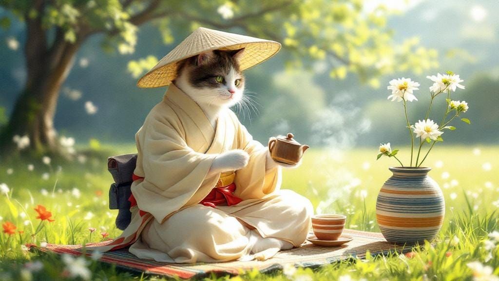 This image shows an anthropomorphic cat dressed for a traditional Japanese tea ceremony. The cat is pouring tea in a sunlit meadow, rendered in a whimsical watercolor style.