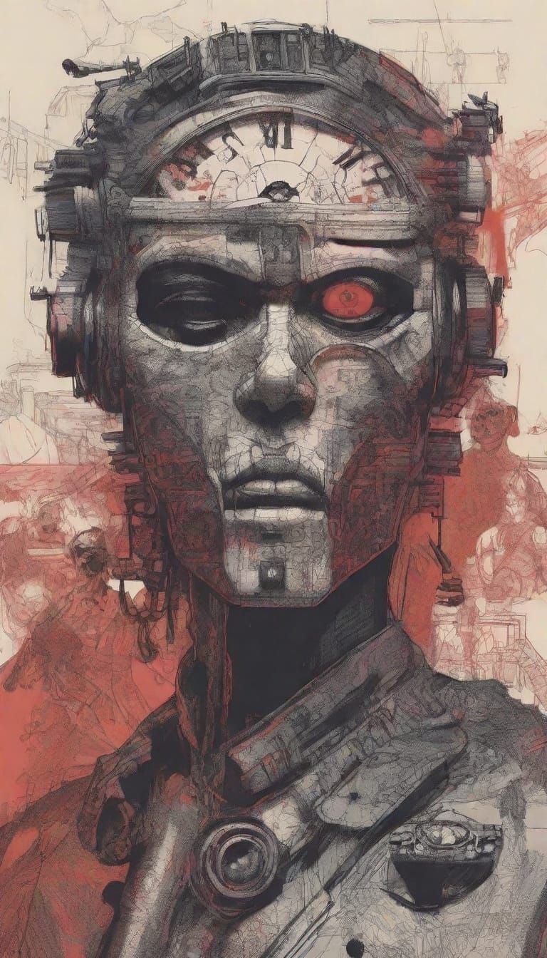 This image is a fusion of Heidelberg school film noir and art brut styles, featuring a voodoo ghoul in a clockpunk horror setting with a demonic fist and sharp ink drawing details.