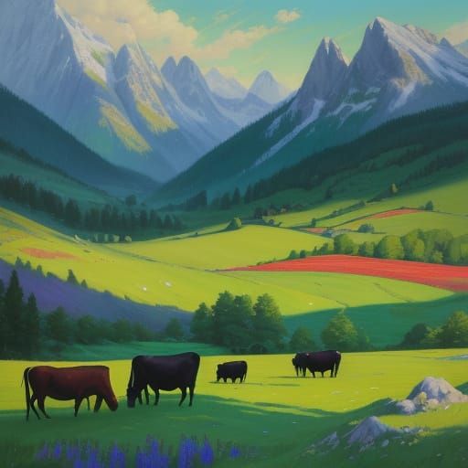 Easily generate unique oil paintings with triadic colors of cows grazing in valleys. Free and simple AI art creation.
