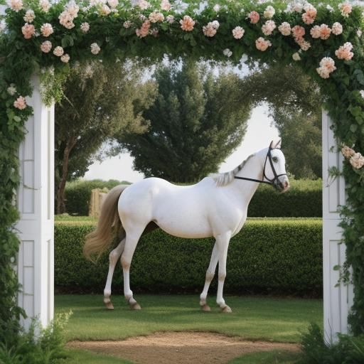 This image shows three athletic women with curly hair in white dresses among flowers and vines, accompanied by a horse. The scene is rendered with photorealistic detail.