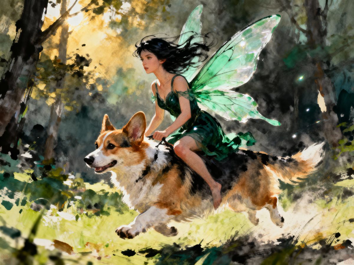 A detailed portrait of a fairy with green wings riding a Corgi through a forest clearing. The image features vivid colors, impasto textures, and expressive brushwork, capturing a natural light aesthetic.
