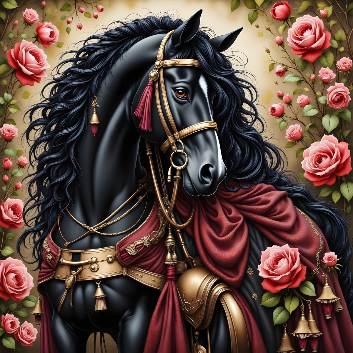 This image features a stunning black horse adorned with ornate velvet tack, waiting in a vibrant rose garden. Rendered as a detailed oil watercolor painting with rich colors.
