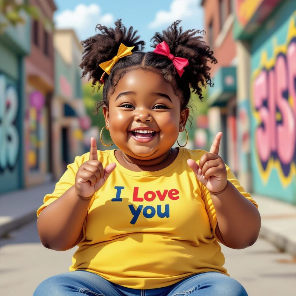 This image features a beaming young Black girl joyfully learning American Sign Language. The artwork bursts with vibrant colors and high contrast, reminiscent of street art.