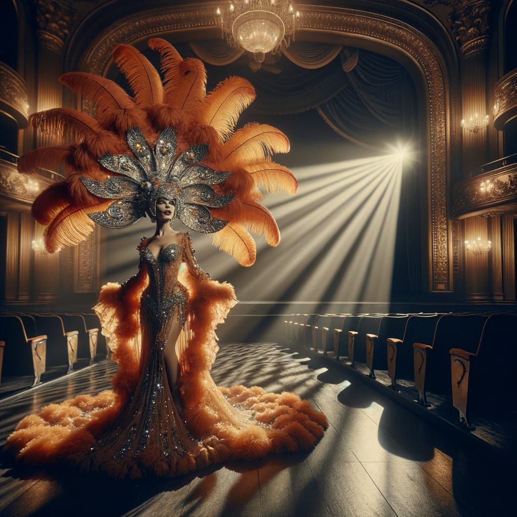 A vintage-inspired showgirl, her elaborate costume shimmering with sequins and an oversized orange feathered headdress, commands the stage o...