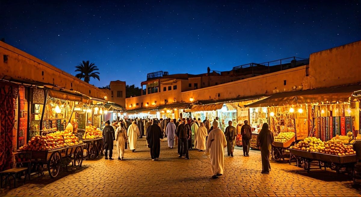 This image captures the enchanting atmosphere of a night market in Marrakesh, with golden lanterns, starry skies, and a kaleidoscope of colors from exotic food stalls and vibrant fruits. The scene exudes a warm, sensual glow reminiscent of impressionist brushstrokes and storybook hues.