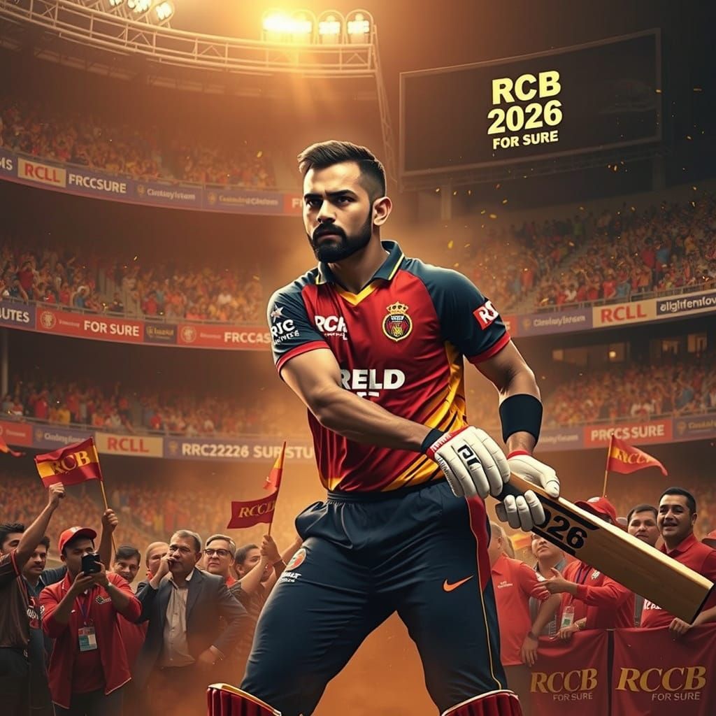 A hyper-realistic portrait of Virat Kohli in mid-batting stroke, surrounded by a packed Chinnaswamy Stadium in warm, golden-red hues, with tearful fans and dramatic lighting, showcasing ultra-detailed textures and deep shadows.