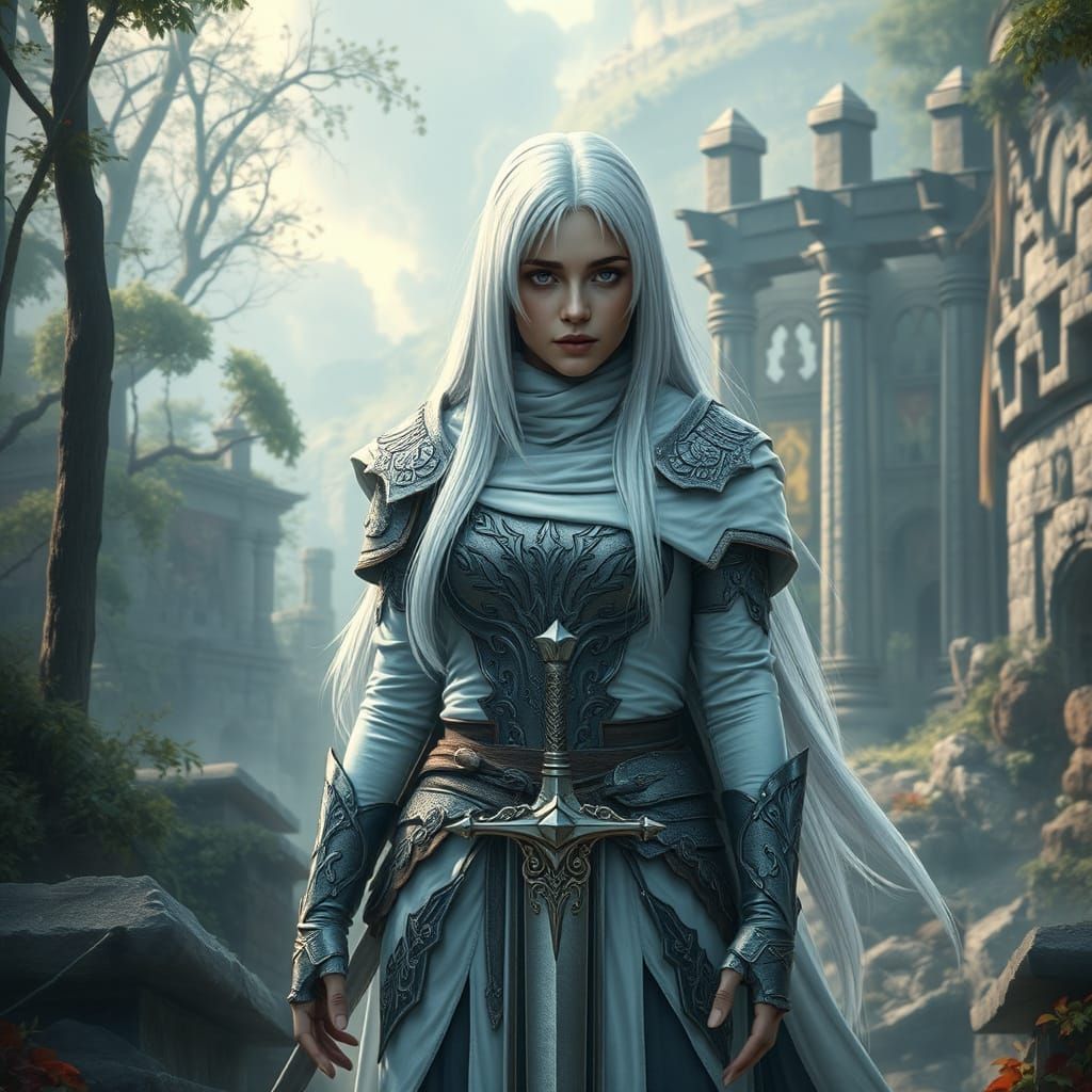 A striking picture of a female warrior standing in a mystical forest. She wears a white and silver tunic with matching armor, rendered with photorealistic detail and cinematic lighting.