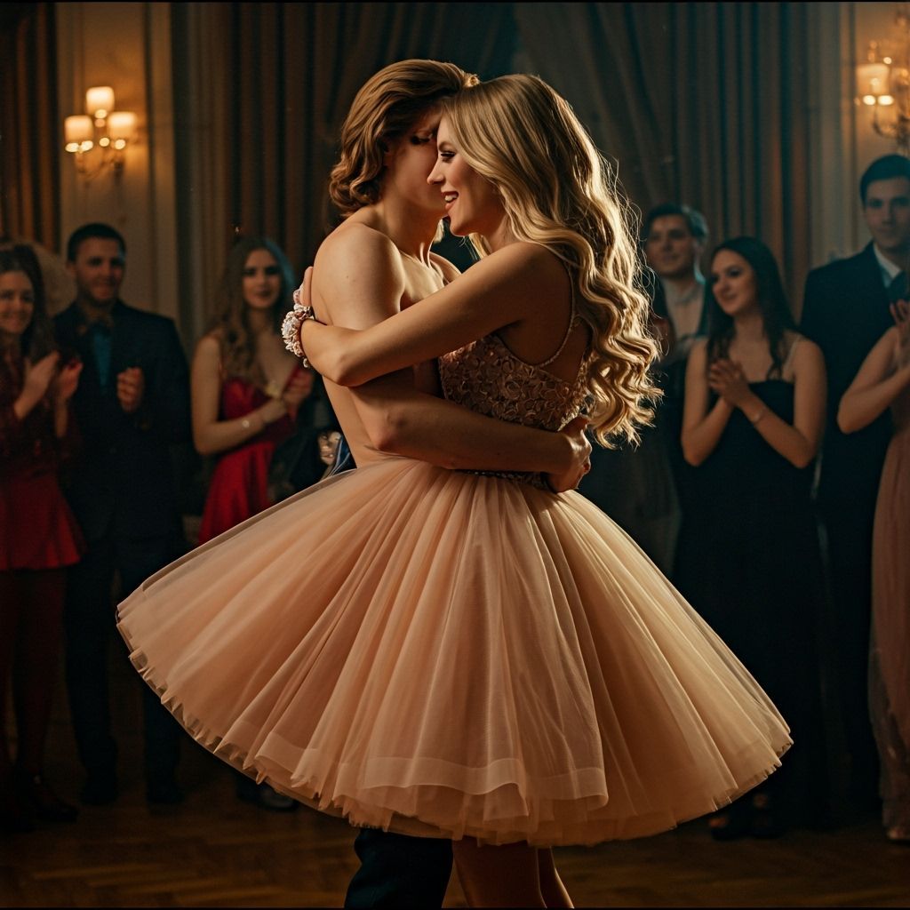Cinematic film still of a young man in a pink prom minidress and wig dancing with a woman at a lively party. Features dramatic lighting and a vintage film aesthetic.