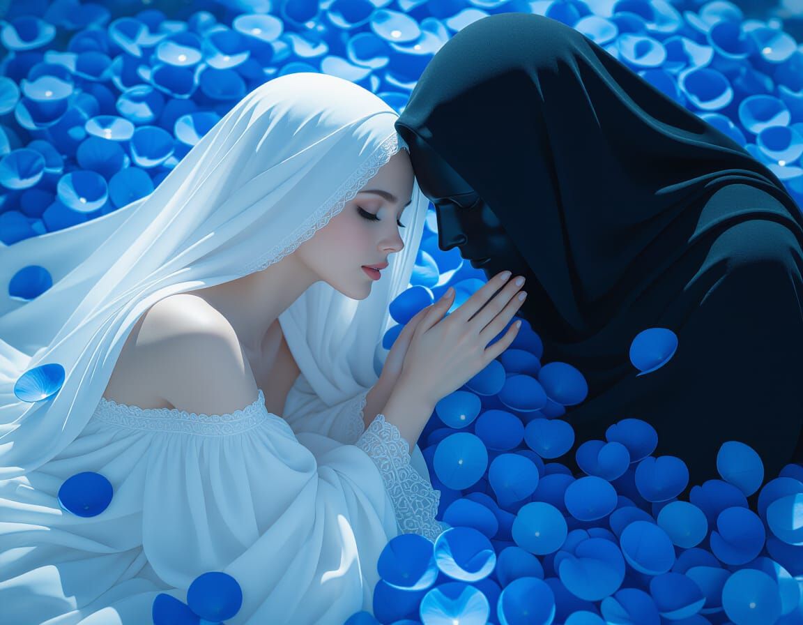 A captivating image showing a woman in white surrounded by blue petals, bathed in heavenly light. The artwork evokes a blend of romance and eeriness, rendered with ultra HD realism.