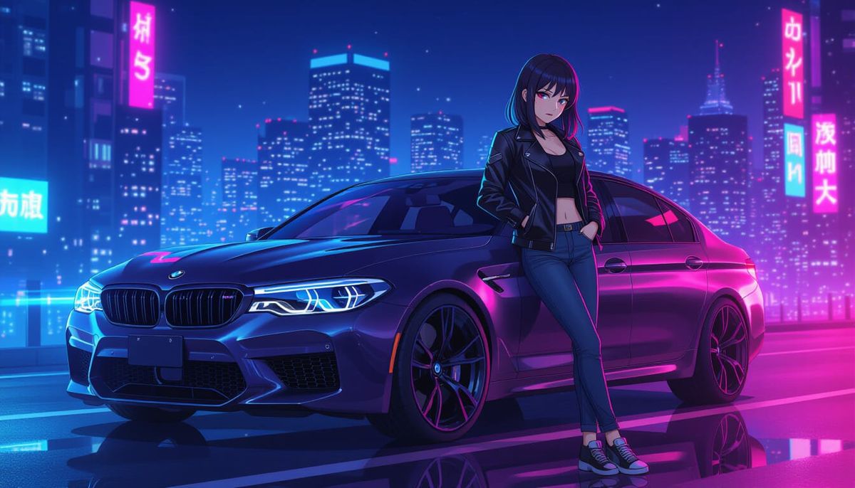 This image shows an anime girl in a black jacket leaning against a BMW M5. The scene features a futuristic cityscape with vibrant neon lights, as 3D digital art.
