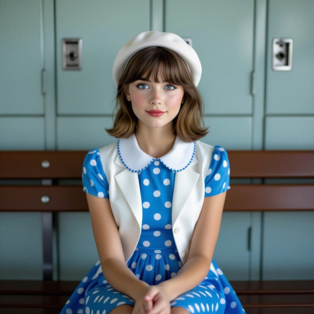 A candid photo from above of a beautiful young French girl sitting on a bench at school. She's wearing a blue polka dot dress and adjusting her collar with an introvert smile.
