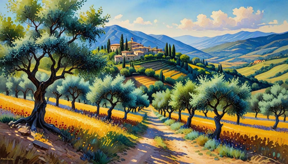 A vibrant watercolor painting showcases olive groves in Montefioralle, Tuscany, during a late summer afternoon. The artwork features a neo-impressionistic style with colorful, textured paint layers.