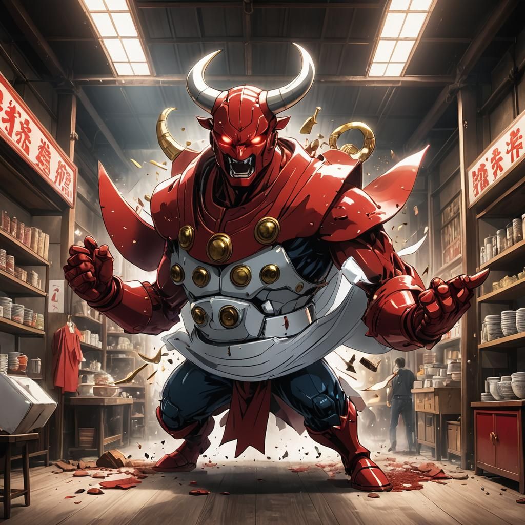 This image shows a crimson, robotic bull destroying a china shop in an anime style. The light reflects off its metallic horns as it charges forward aggressively.