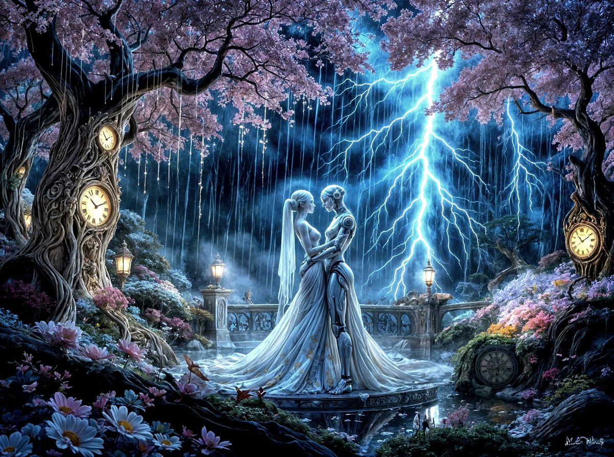 A surreal image of an android and human embracing in a garden landscape during a storm. The scene is rendered with an ethereal glow, matte oil painting texture, and Art Nouveau-inspired details.