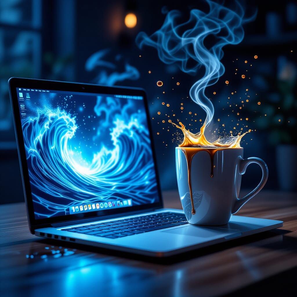 A hyper-detailed digital painting captures a moment of chaos as a coffee mug tips over, spilling droplets. A glowing laptop screen reflects the dramatic scene.
