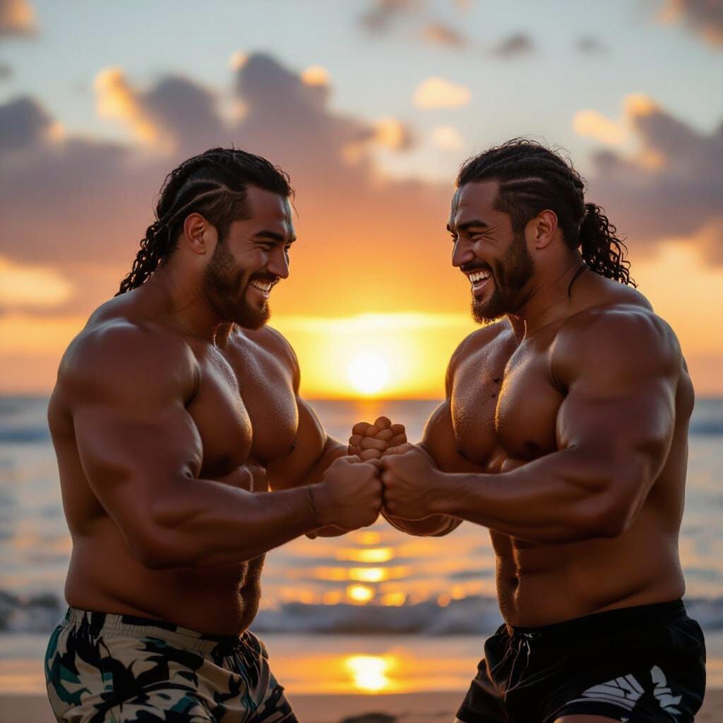 This hyper-realistic photo shows muscular Tongan men wrestling on a Hawaiian beach during a vibrant sunset. Cinematic lighting highlights their athletic physiques and dynamic movements.