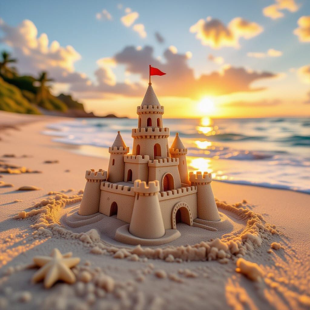 This image depicts a detailed, photo-realistic sandcastle on a beach during a vibrant sunset. It features a magical, cheerful atmosphere with soft lighting and playful elements, rendered in an impressionistic, dreamy style.