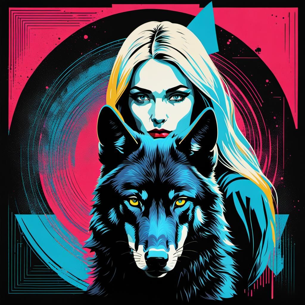 This image shows a blonde girl alongside a black wolf. The artwork uses a pop art style with triadic colors, high resolution, and geometric Bauhaus elements.