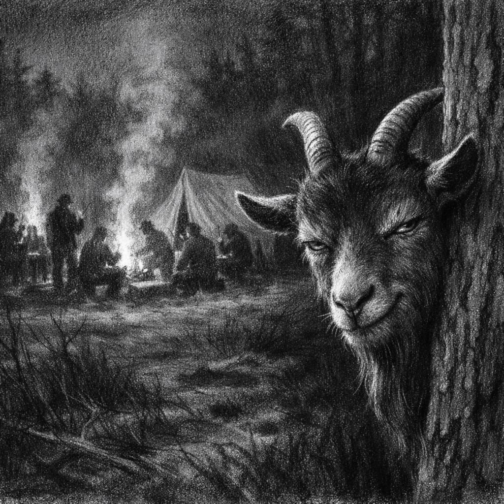 This ultra-realistic charcoal and graphite drawing captures a nocturnal bandit camp under moonlight. A watchful goat in the foreground observes the scene, rendered with striking detail and contrast.