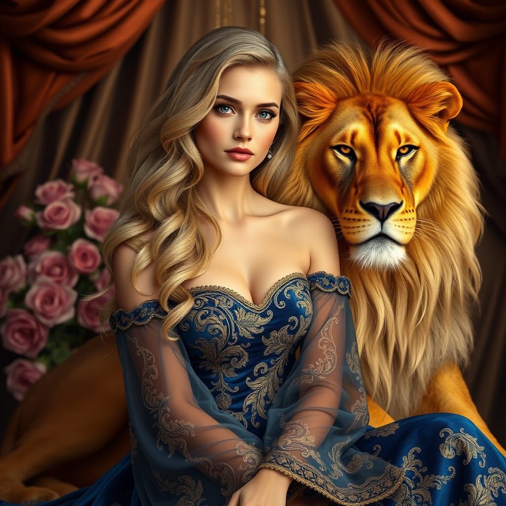 A photo of a woman with blonde hair seated gracefully beside a powerful lion with a thick, golden mane. The woman is wearing an intricate, blue and golden embroidered velvet gown with sheer sleeves. Her hair cascades in soft waves around her shoulders. The lion sits calmly beside her, symbolizing strength ...