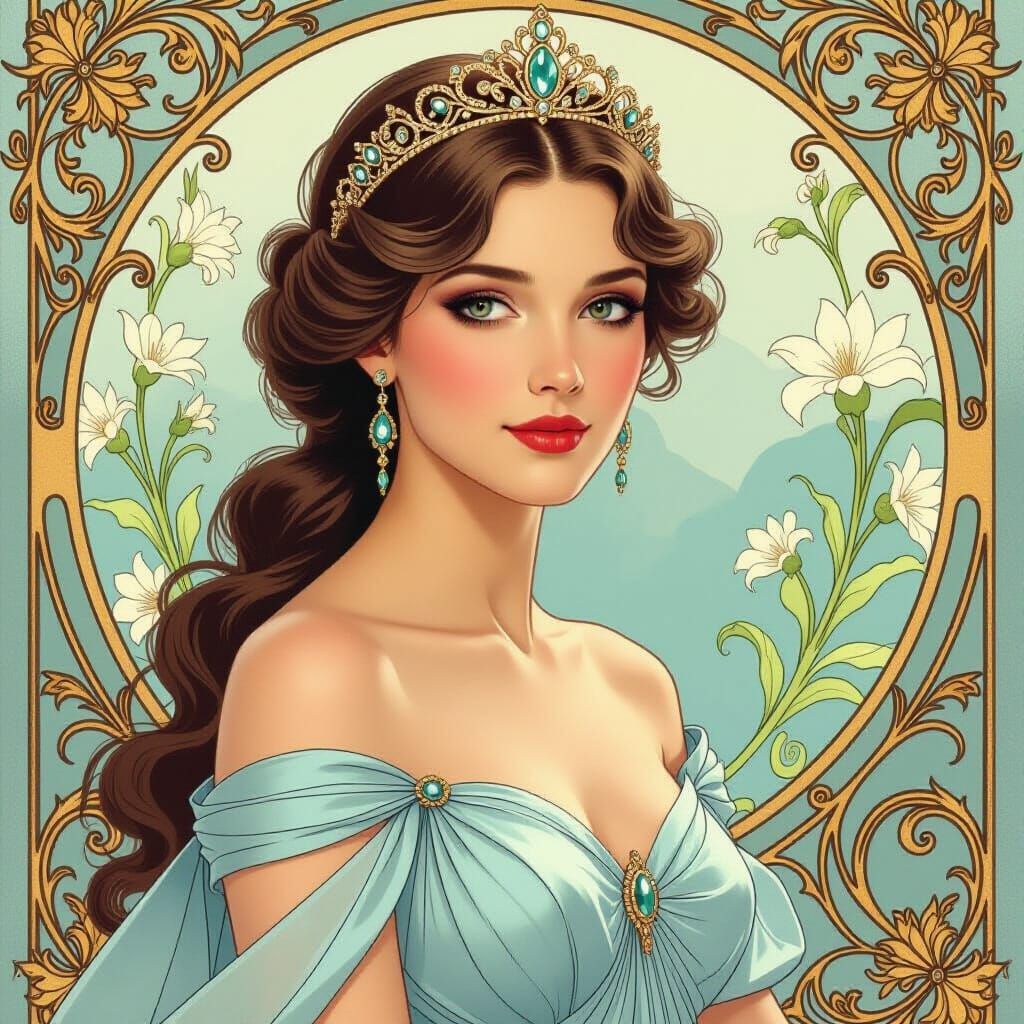 A stunning image of a woman wearing a tiara and silk dress. The artwork features flowing lines and vibrant textures in an art nouveau style.