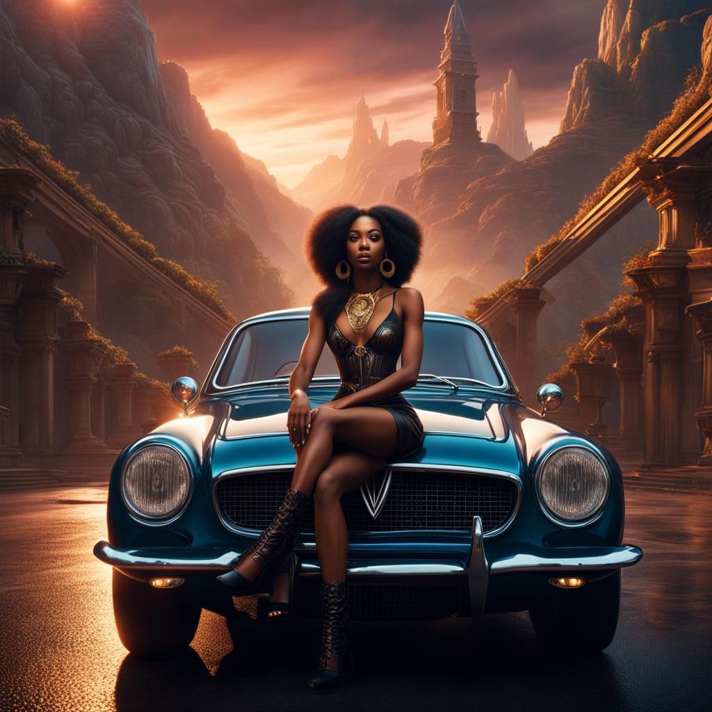 This image features a beautiful young Black woman sitting on a car, presented as a detailed matte painting with intricate details. The artwork employs complementary colors and a fantasy concept art style.