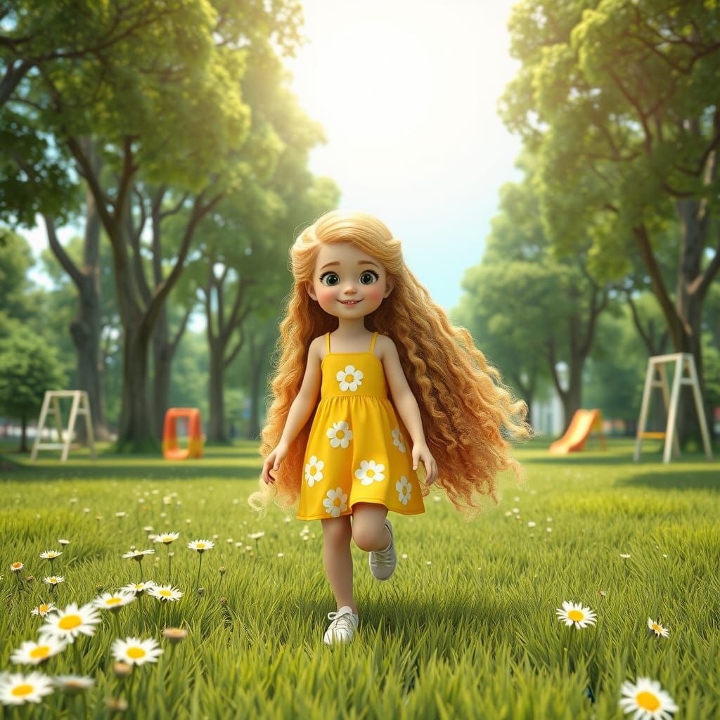 This image showcases a young girl with incredibly long, curly blonde hair, playing in a lush green park filled with colorful swings, slides, and wildflowers, set against a stunning radial gradient background with a cinematic feel.