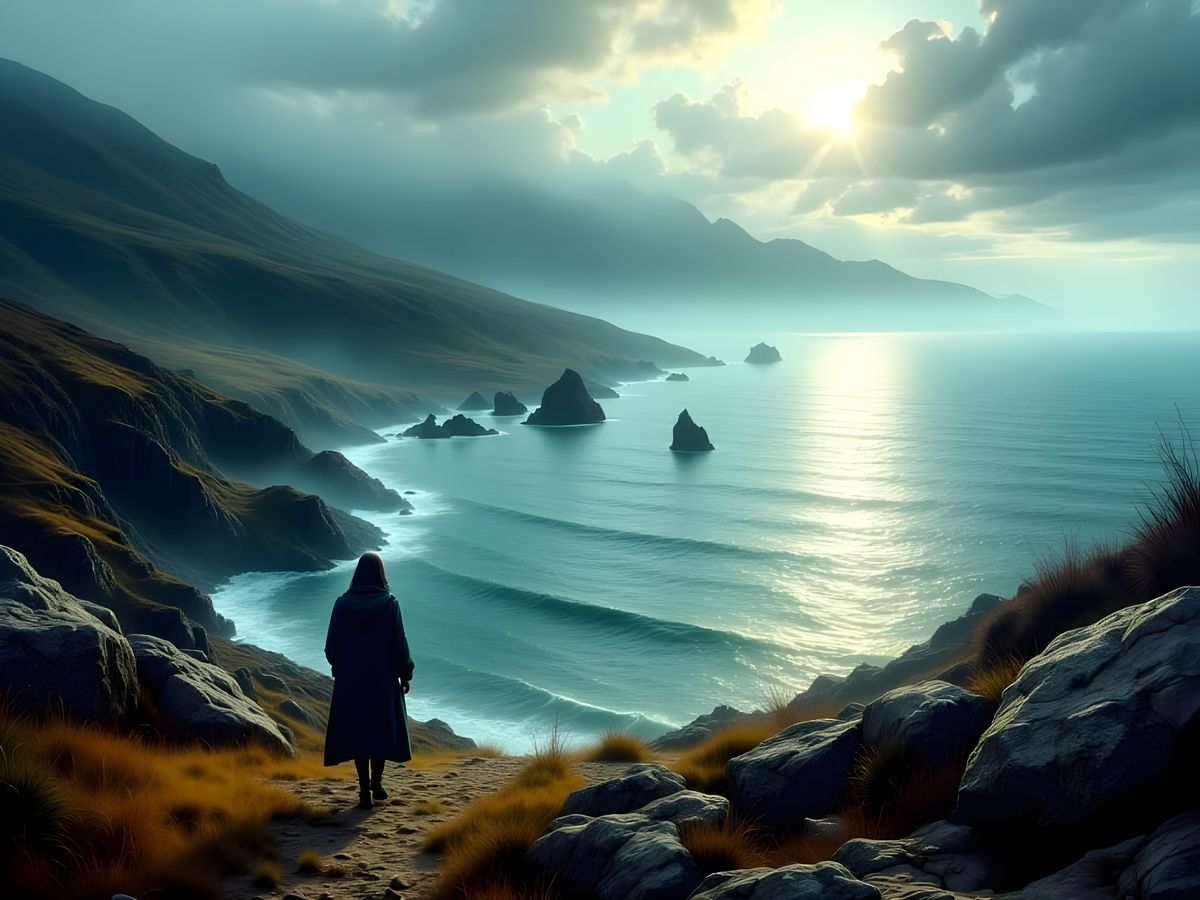 This image captures a vintage pulp art style, depicting a lone figure strolling hills overlooking the sea, shrouded in mist and mystery.