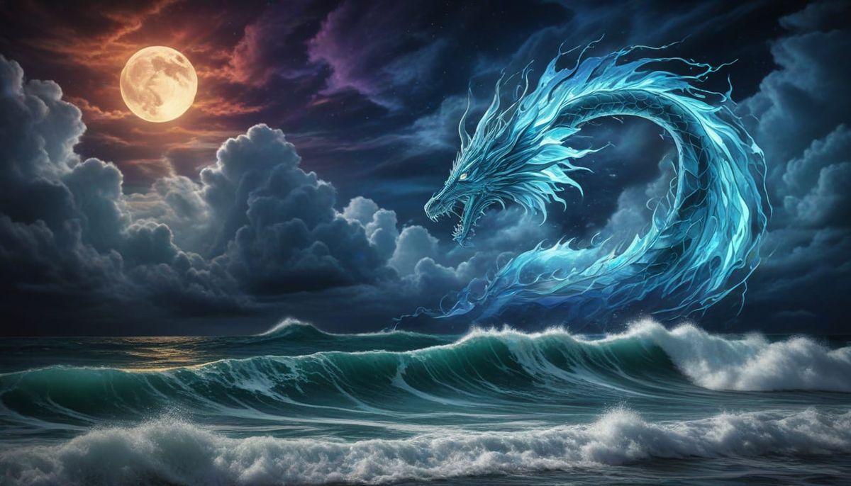 A vibrant stained glass image of a celestial dragon rising above a stormy ocean. The dragon brings lightning and thunder, illuminated by moonlight filtering through the clouds.