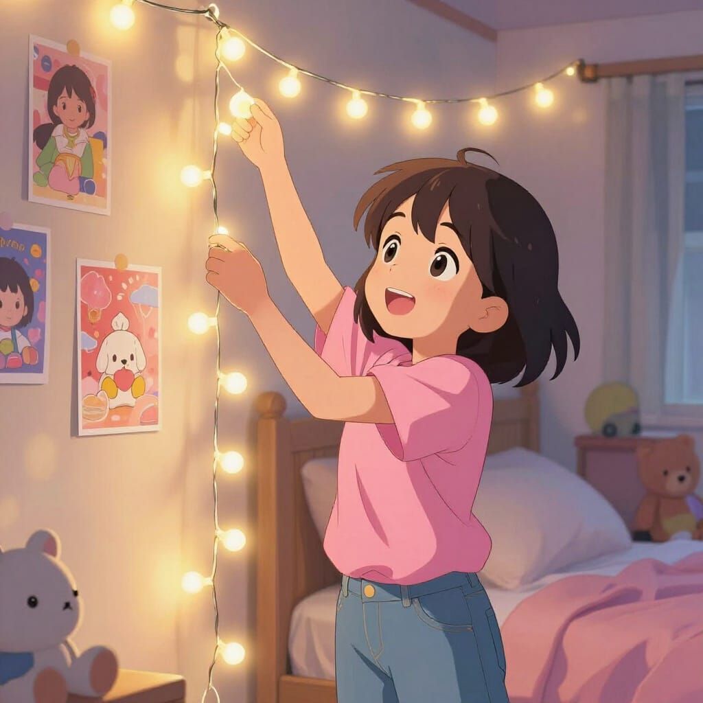 This anime-style image shows a joyful girl enthusiastically decorating her cozy bedroom with twinkling fairy lights, creating a warm and magical glow. Vibrant colors and soft shading enhance the cheerful atmosphere.