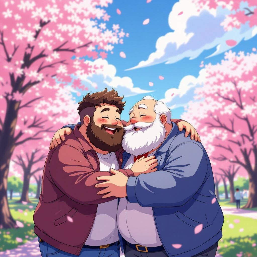 This image shows two bearded men embracing in a Tokyo park filled with cherry blossoms. The scene is rendered with cinematic lighting and cel-shaded techniques, reminiscent of anime art.