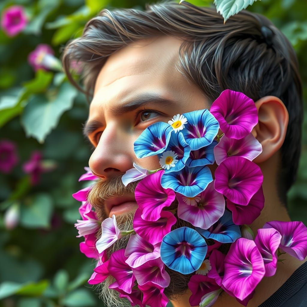 A surreal portrait of a man with a beard made of vibrant morning glory flowers. The image is highly detailed with a psychedelic aesthetic, reminiscent of trending digital art.