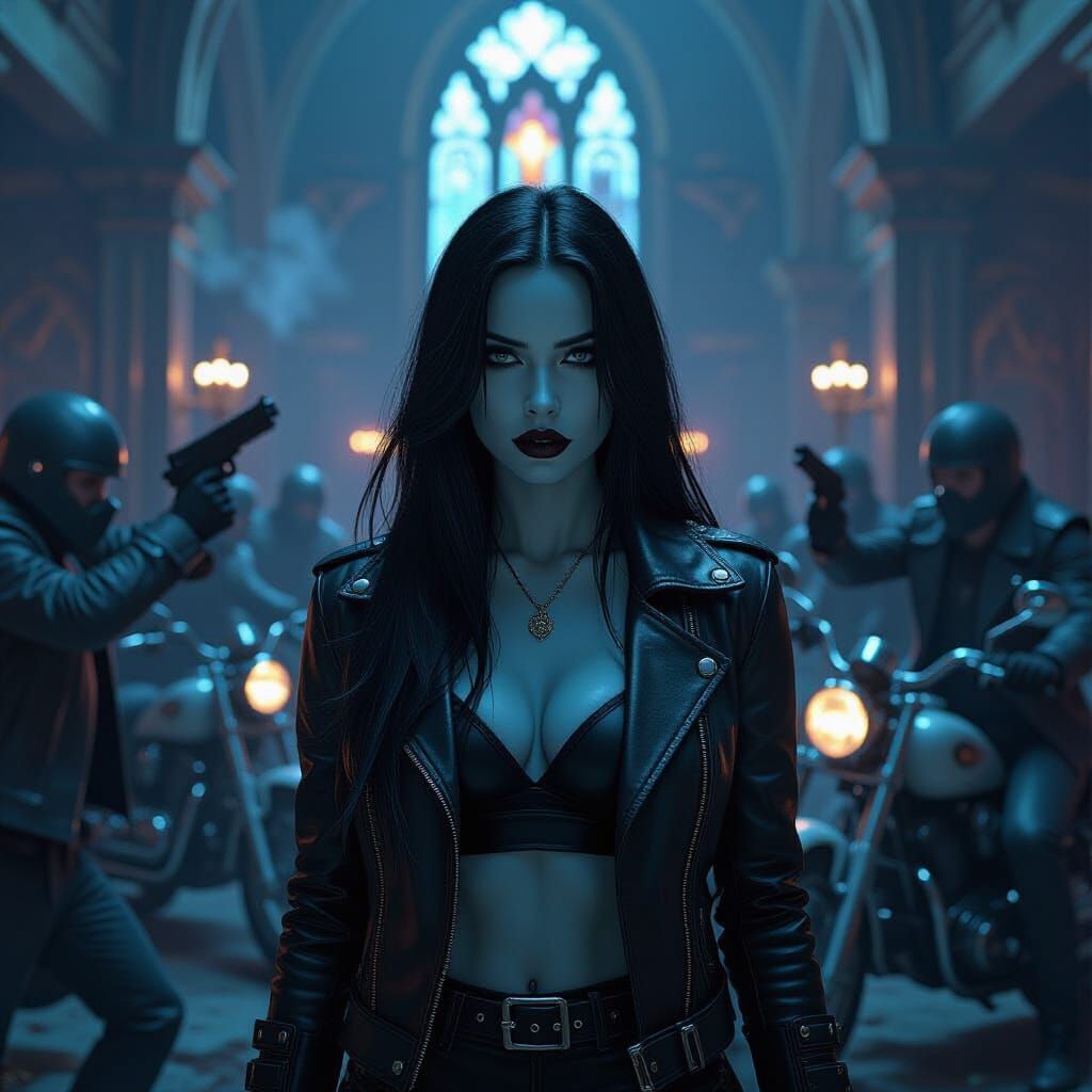 A blue-skinned woman leads bounty hunters in a fierce fight against bikers inside a dark, ornate chapel, rendered with gritty realism and neon intensity.