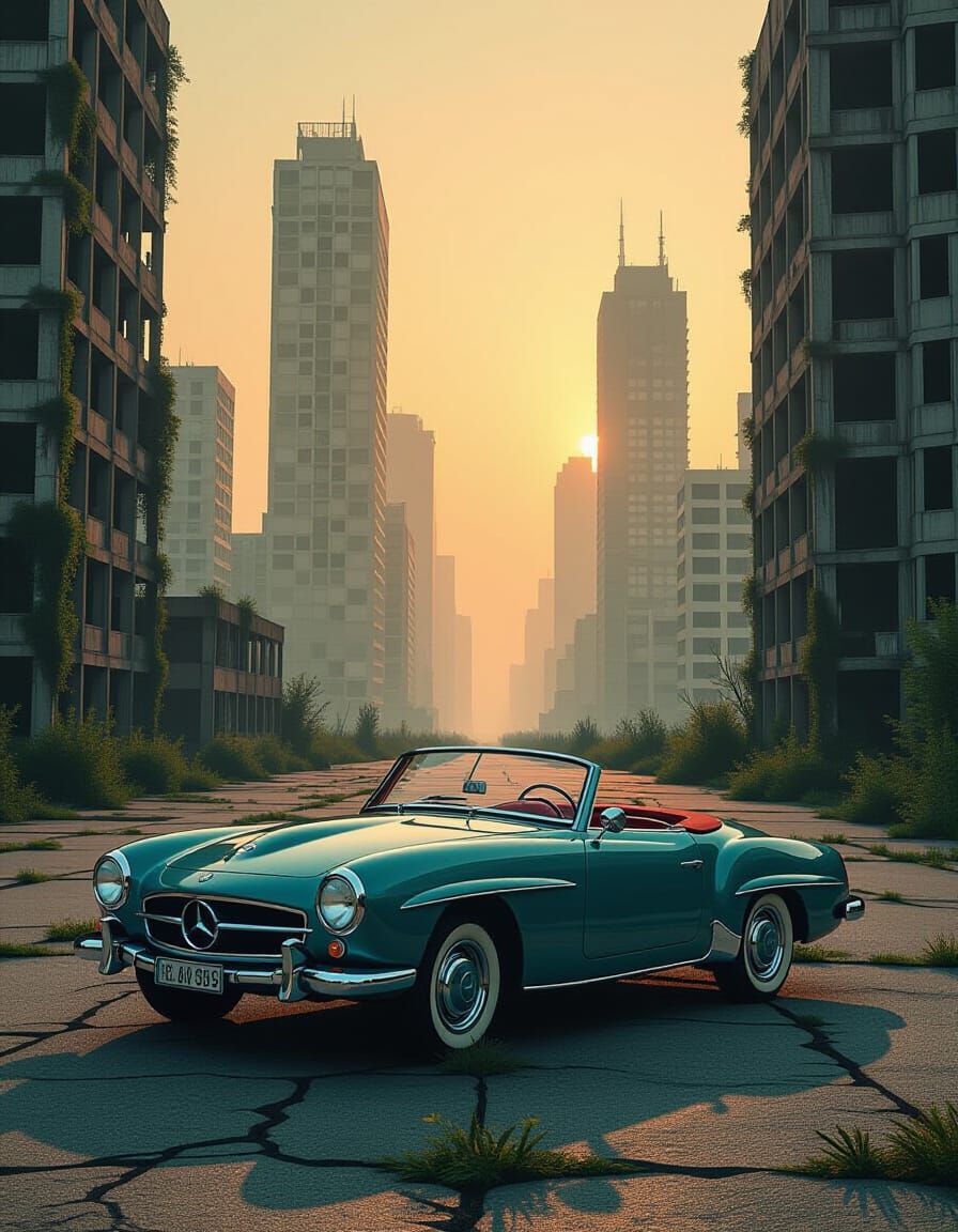 This image shows a restored vintage Mercedes-Benz 190 SL on a cracked, overgrown runway in a decaying, futuristic city. Vines climb skyscrapers under a hazy orange sky, depicted with gritty realism.