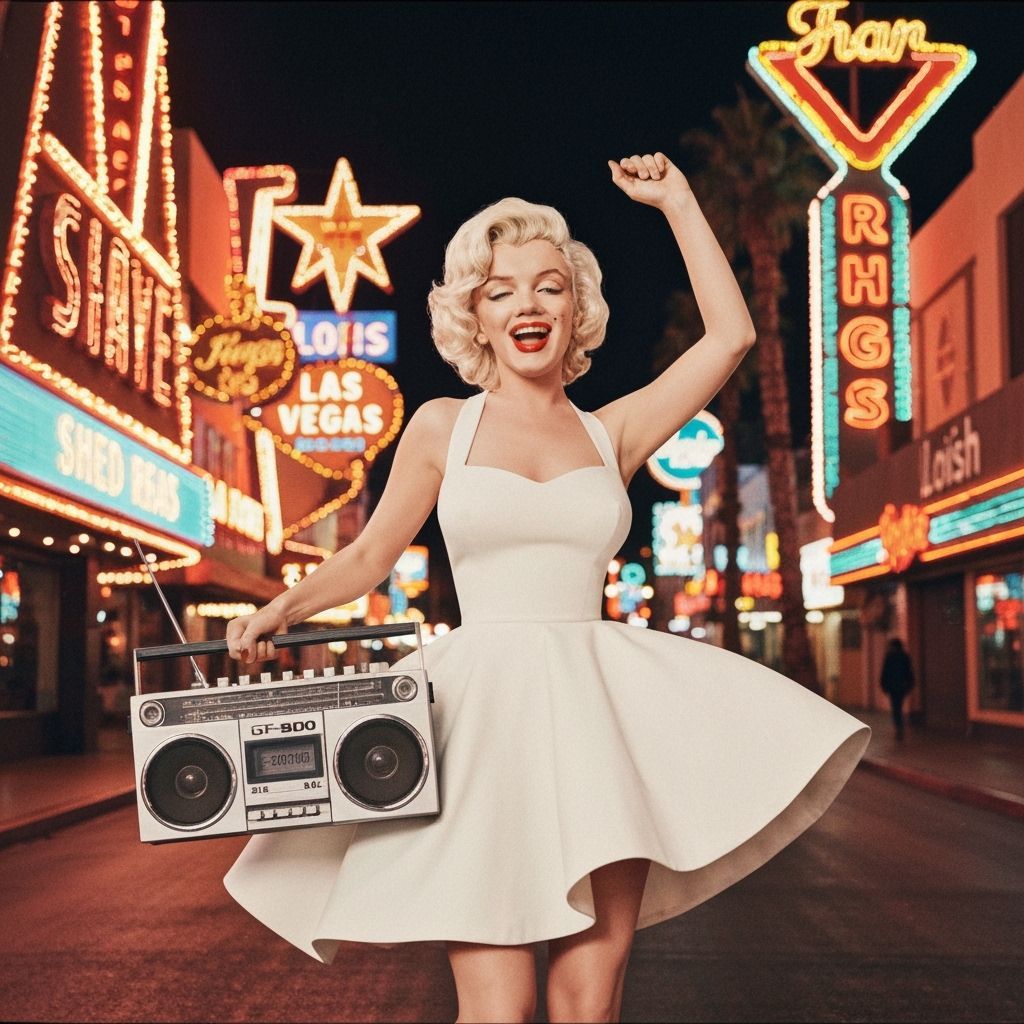 A vibrant image of Marilyn Monroe dancing on a Las Vegas street. The scene is set at night with neon signs, vintage logos, and soft lighting, reminiscent of a retro-futuristic photograph.