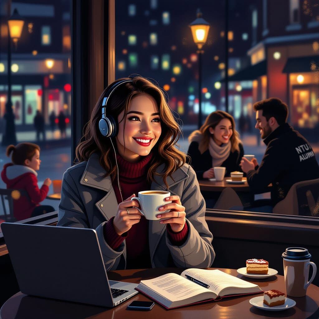 This digital painting captures a woman smiling in a cozy night cafe. She holds a coffee cup beside her laptop, book, and pen, with children playing outside. The scene evokes quiet, candid moments with atmospheric lighting.