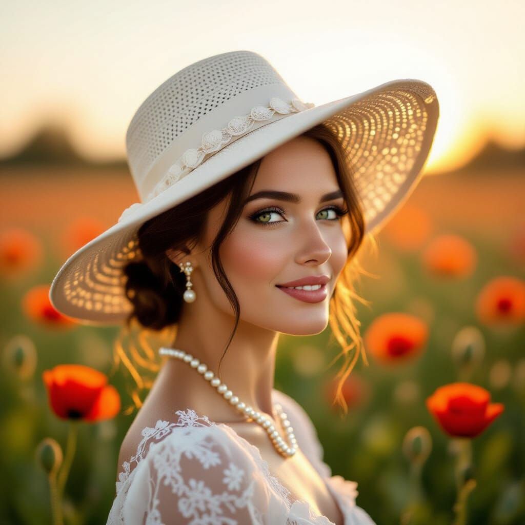 A glamorous, stylized portrait illustration depicts a woman adorned with a dramatic, wide-brimmed white hat, its delicate lace trim cascading around her face and casting intriguing shadows. Her elegant profile is highlighted by a subtle smile and piercing emerald green eyes, with a single strand of pearls ...