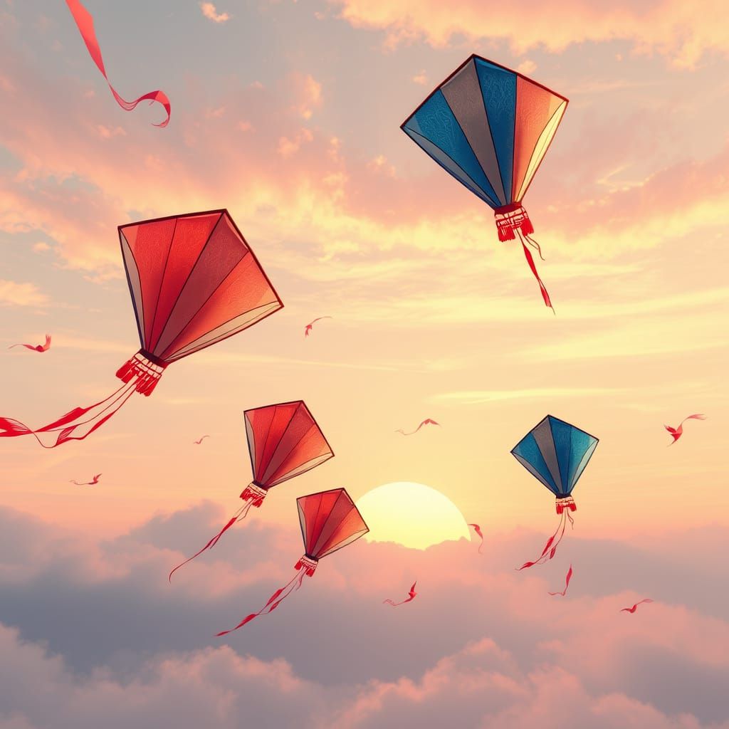 This image shows a breathtakingly realistic anime-style scene of kites soaring at sunrise, set against a soft pastel sky with gentle morning mists and intricate details reminiscent of Japanese concept art.