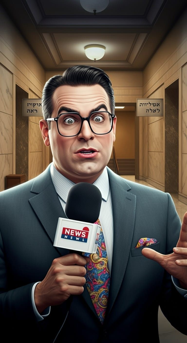 This image shows a cartoonish legal correspondent reporting live from an Israeli courthouse. The illustration features bright lighting and news-style framing with a satirical tone in a semi-realistic comic style.