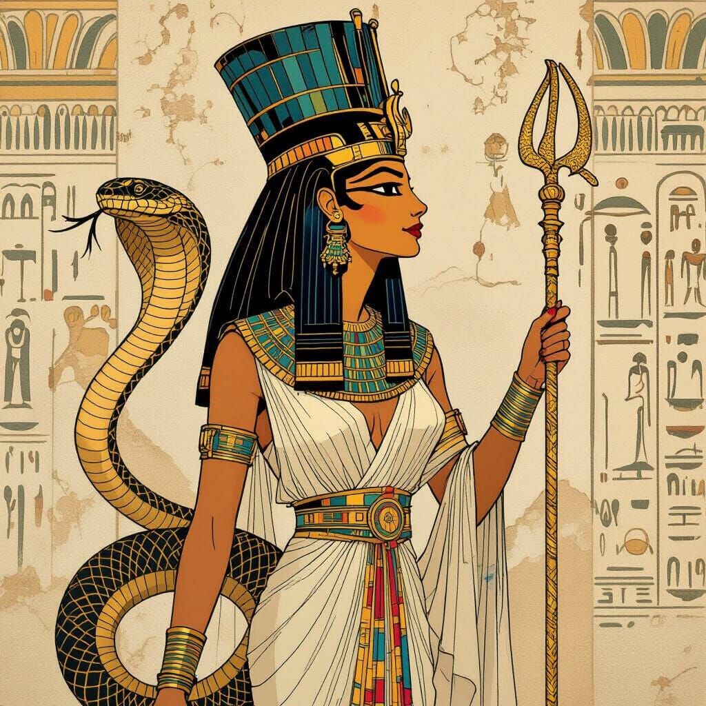 A striking picture of an Egyptian cobra winding around ancient mural walls, seamlessly transitioning into Cleopatra, who is regally adorned in golden attire and holding a glittering staff, in a vibrant, stylized aesthetic.